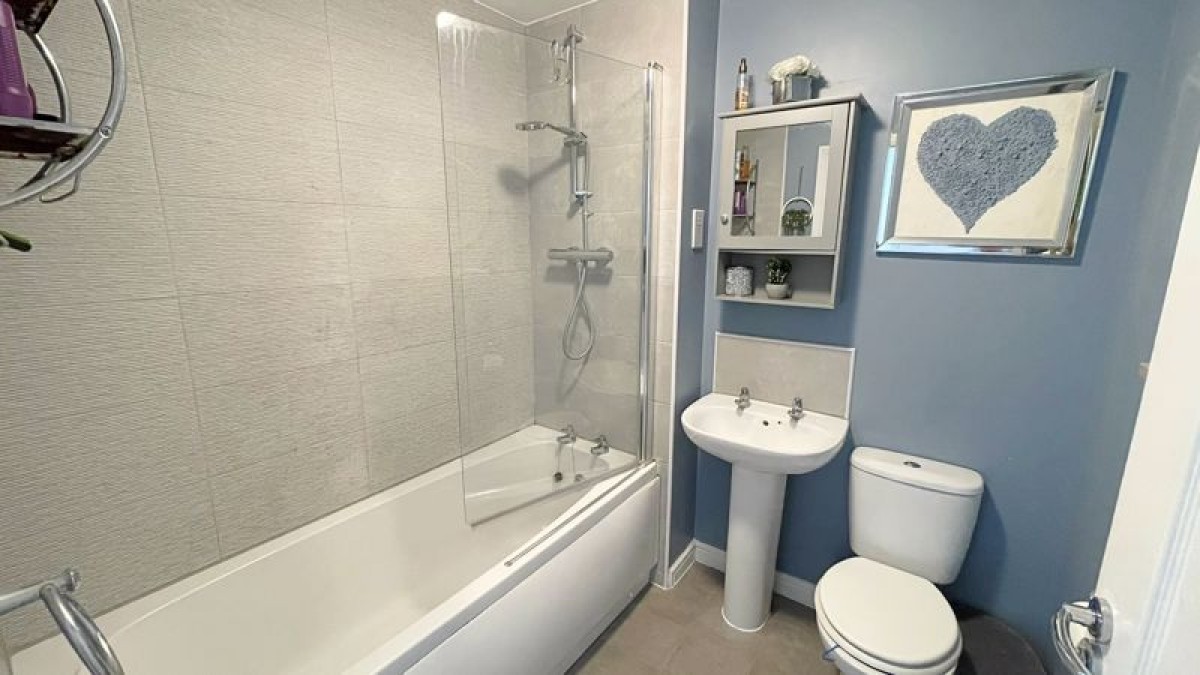 Having 3 piece suite comprising panelled bath with mains fed shower and glass shower screen over, pedestal wash hand basin, low level WC, wood effect vinyl flooring, radiator, part tiled walls and extractor.