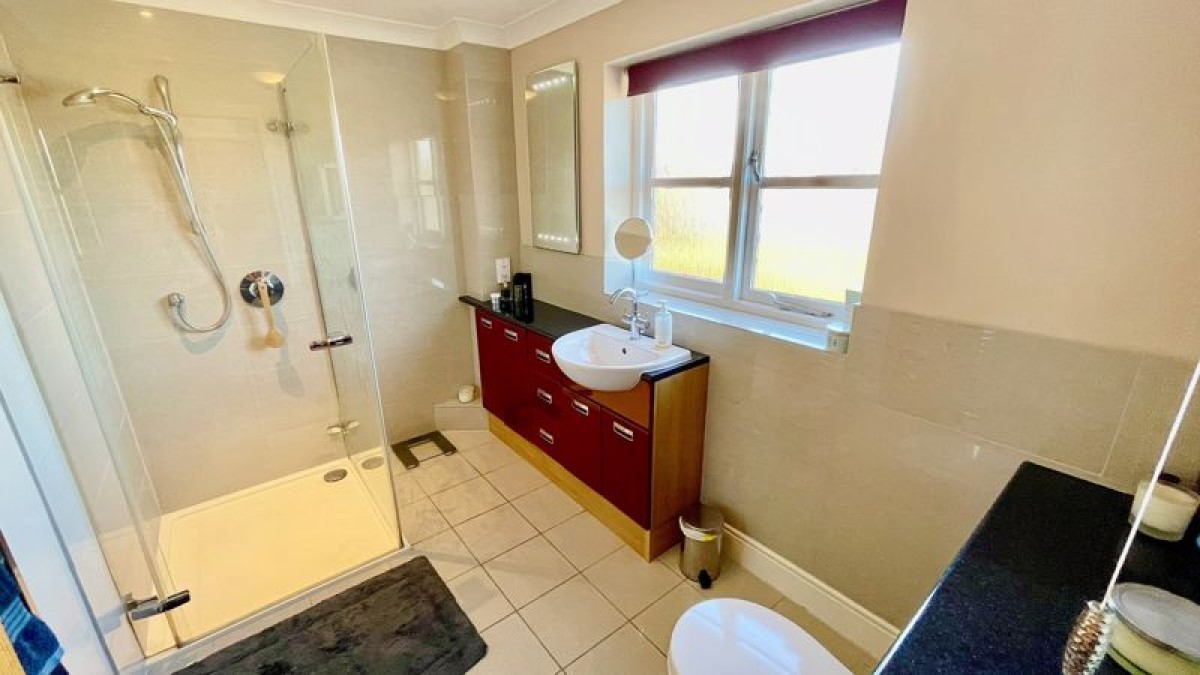 Having spacious 3 piece suite comprising tiled shower cubicle with power shower and glass side panel door, wash hand basin set in vanity unit, low level WC, ceramic tiled floor with underfloor heating, heated towel rail, part tiled walls, coved ceiling, electric shaver point and extractor.